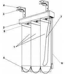 - Îndepărtați folia de protecție de pe cornișă (dacă este cazul). Introduceți cornișa în consolele tavanului până la fixare, luând în considerare localizarea lanțului (7) și frânghiei de reglare (6).