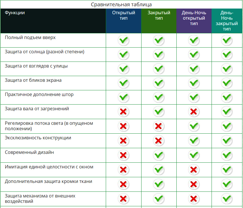 Существуют различия в функциональных возможностях рулонных штор, которые представлены в таблице: