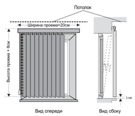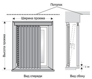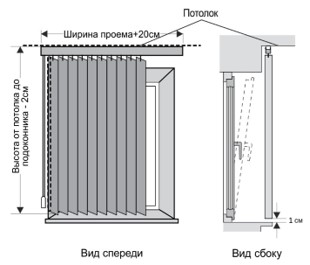 3. К потолку: При монтаже вертикальных жалюзи к потолку, надо замерить высоту от потолка до подоконника и вычесть из полученного результата 1 см. Это будет высота жалюзи в том случае, если подоконник будет выступать за линию оконного проема. А если жалюзи будут скрывать подоконник, то их длина будет равна высоте от потолка до подоконника плюс 5 см. Ширина должна превышать оконный проем на 10 см минимум.